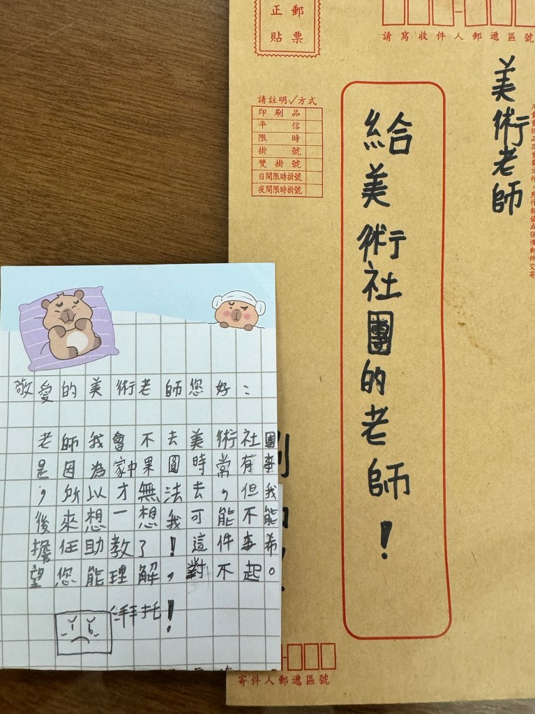 I haven’t received many letters in my life. One was from my elementary school teacher, Ms. Chen Aimei, who was very fond of me (I’ve tried searching for her online, but couldn’t find her). Another was a birthday card from my niece and nephew. Both were happy letters. Today, however, I received a letter from one of the children in my after-school program, and it weighs heavily on my heart. The letter says that he cannot attend class or serve as my assistant anymore, as he must help his family with their orchard. He very politely wrote this letter of apology, adding a sad face beside his words.