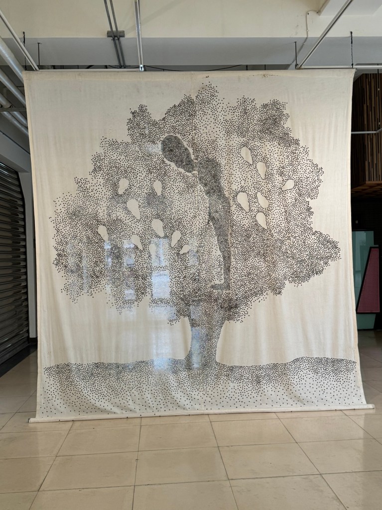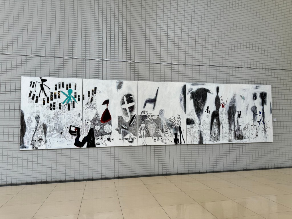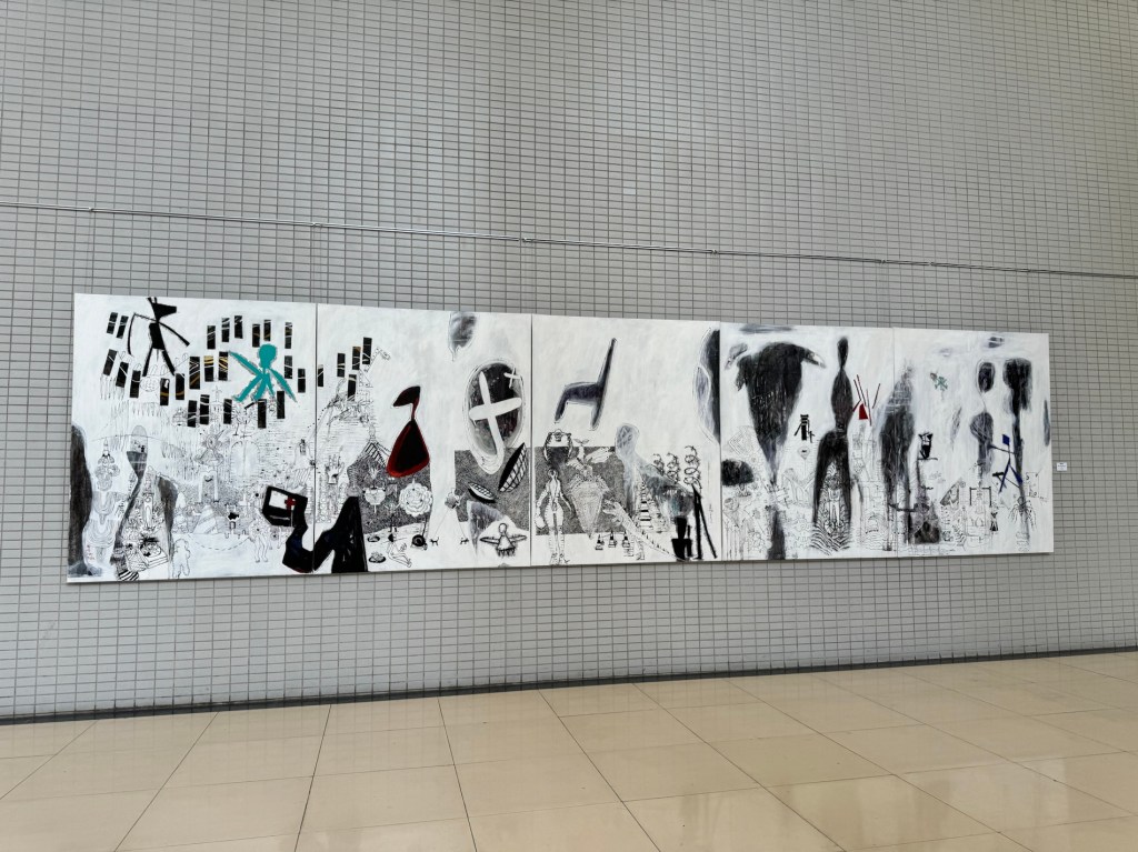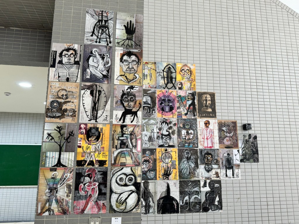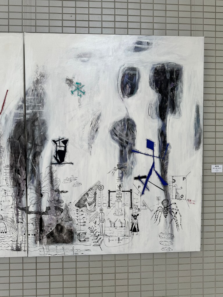 Today’s itinerary included visits to the exhibition of Teacher Dai Mingde in Minxiong, Chiayi, Su Xiaomeng’s exhibition at the Xinying Cultural Center, and the Yuefu Art Gallery in Shanhua. At Teacher Dai’s venue in Chiayi, I wanted to see if his works would present a different style compared to those displayed yesterday at the Mingguan Art Museum, as well as observe how he arranges his exhibitions in different venues. What surprised me, however, was Teacher Dai’s unconventional works using dovetail nails, as well as pieces by an Italian artist, which made me reflect on the relationship between my paintings and contemporary art.
