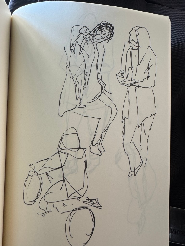 今天是高雄文化局展覽的第四天,我到文化中心顧攤。無聊之際自己拿著速寫本出來速寫動態及靜態的人物 速寫當中需仔細觀察所有的人物。而其中看到許多練舞的團體不停的重複著幾個動作。忽然間想到了繪畫的過程,我也必須要不斷地磨練自己再精進。雖然每個人有不同的人生,不過絕大多數的人卻都努力地過著自己的生活。加油!繼續下一個目標,下一次的展覽一定要更好。